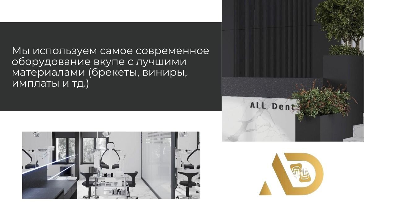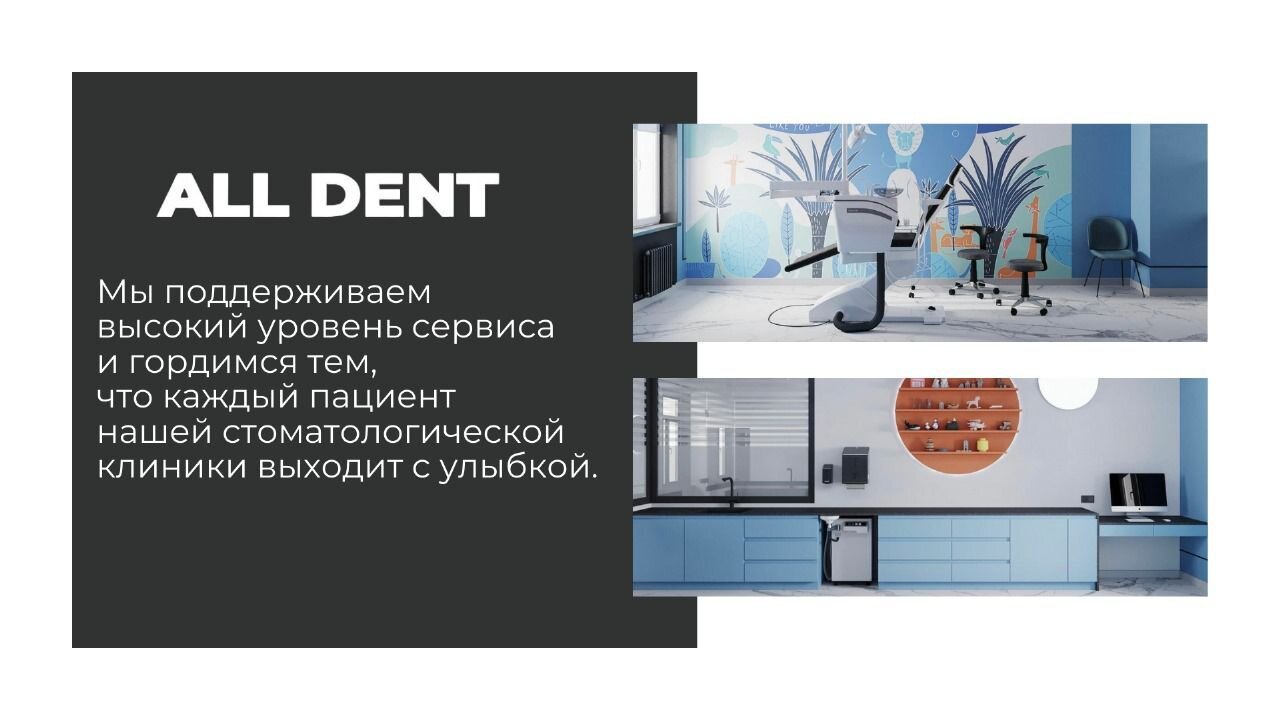 Если вы собираетесь добиться ровной и сверкающей улыбки, то работу над ней лучше доверить экспертам. В стоматологии All Dent имеется специализированное оборудование для того, чтобы ваши зубы всегда были здоровыми. В нашей стоматологии оказывают услуги лечения кариеса, удаления зубов, компьютерной томографии, отбеливания, исправления прикуса, рентгенологической диагностики, изготовления имплантов, а также установки металлокерамики, брекетов, имплантов, виниров. Пусть ваша улыбка будет яркой, а зубы крепкими!